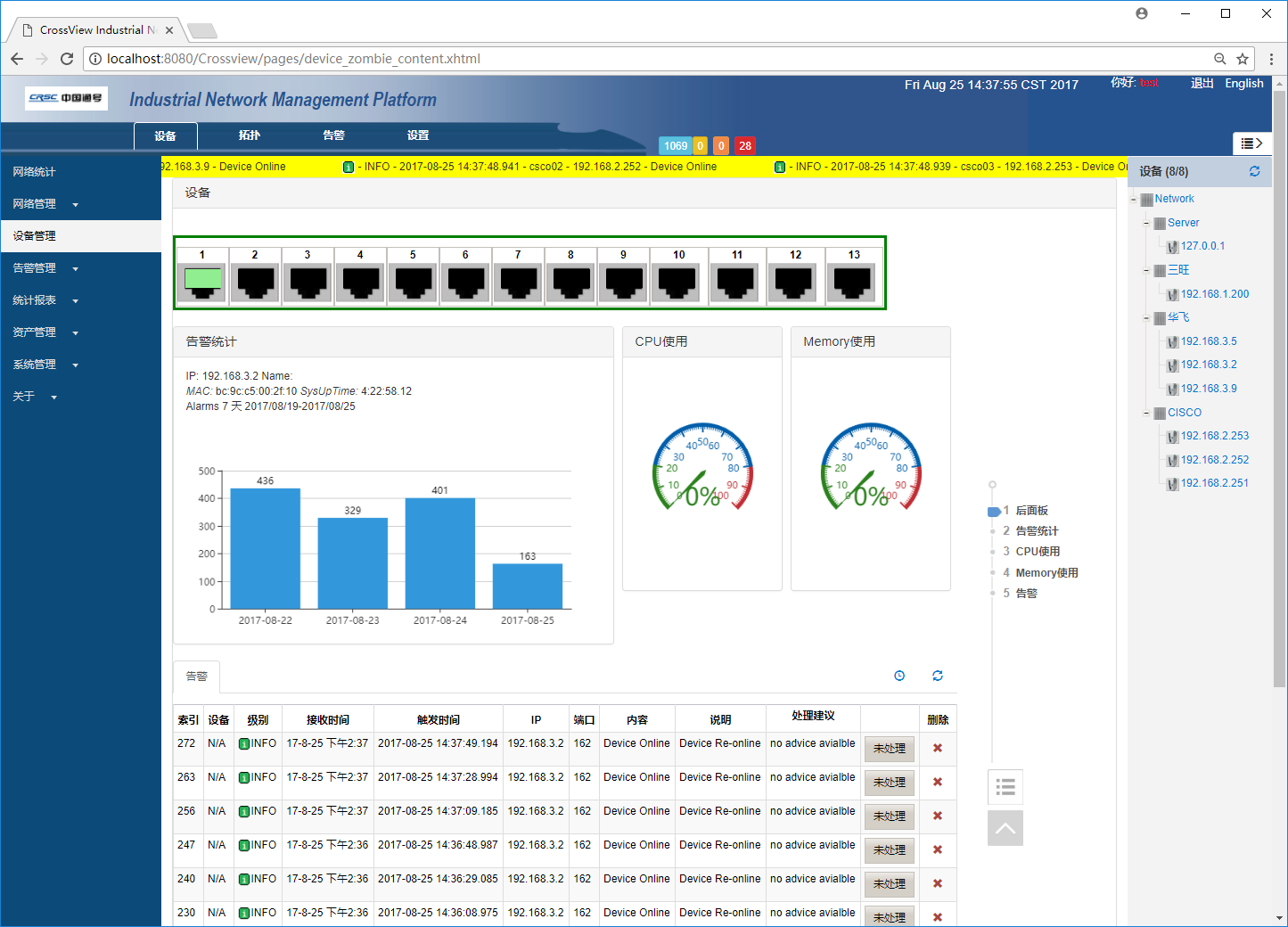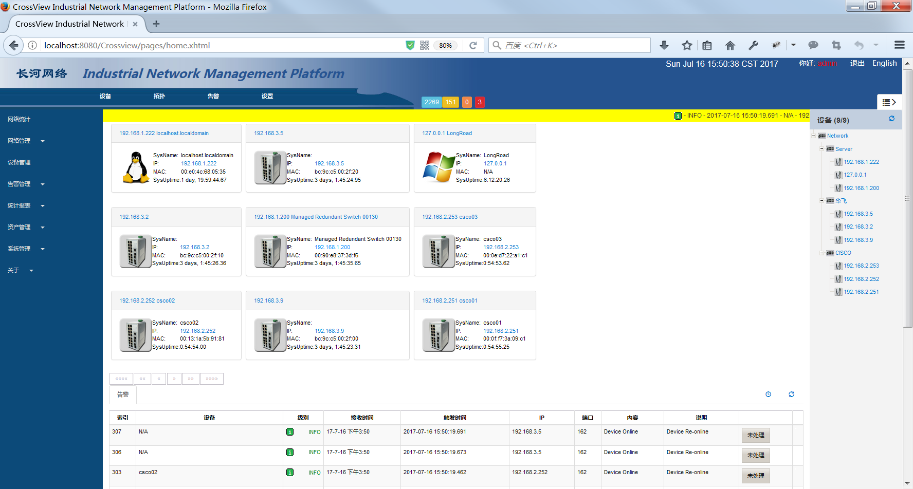 CrossView? 使用國際標準的簡(jiǎn)單網(wǎng)絡(luò )管理協(xié)議(SNMP協(xié)議)迅速搜索以太網(wǎng)內所有網(wǎng)絡(luò )資源,可多視圖展示和實(shí)時(shí)刷新網(wǎng)絡(luò )拓撲結構及關(guān)鍵鏈路,對于網(wǎng)絡(luò )的異常狀態(tài)及時(shí)發(fā)出報警,并為網(wǎng)管人員提供各種形式的報表和報告,從而幫助網(wǎng)管人員更加方便地對網(wǎng)絡(luò )設備進(jìn)行管理。