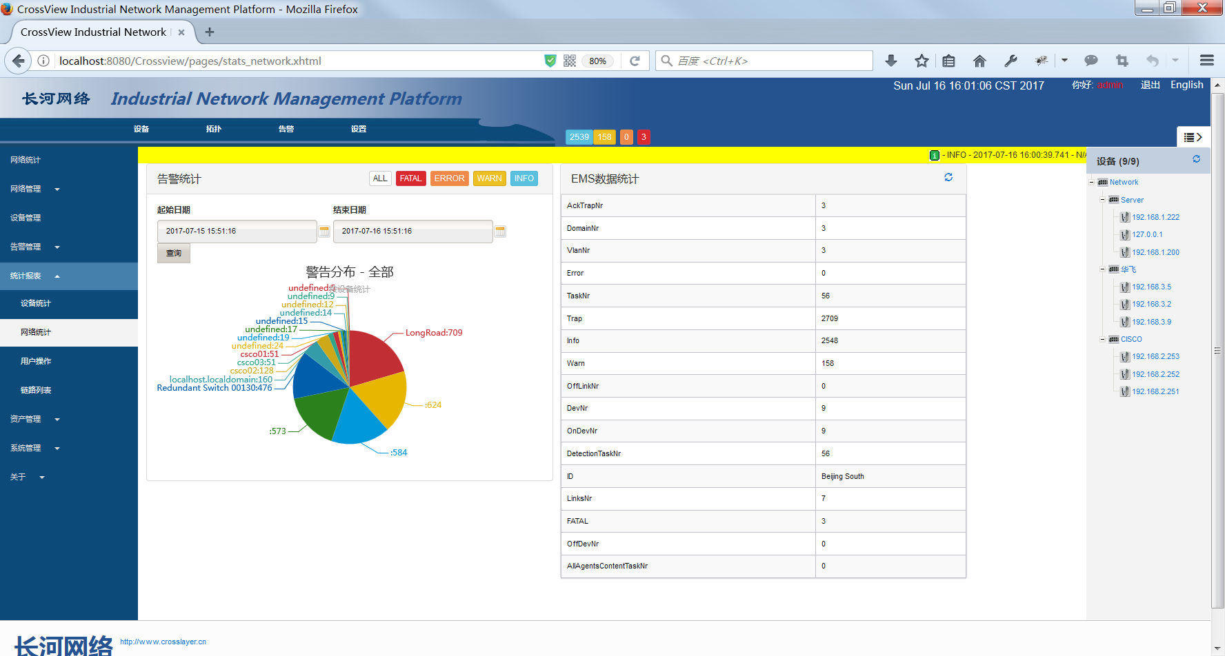 對于網(wǎng)絡(luò )運行中的異常狀況, CrossView? 可自動(dòng)發(fā)送聲音、Email、短信等告警通知。CrossView? 功能非常完善,它不僅方便網(wǎng)絡(luò )管理人員查詢(xún)網(wǎng)絡(luò )運行日志、數據庫等歷史記錄,而且提供了直觀(guān)簡(jiǎn)明的圖表報告,如條形圖、曲線(xiàn)圖、餅圖、分布圖、報 表、web報告等。